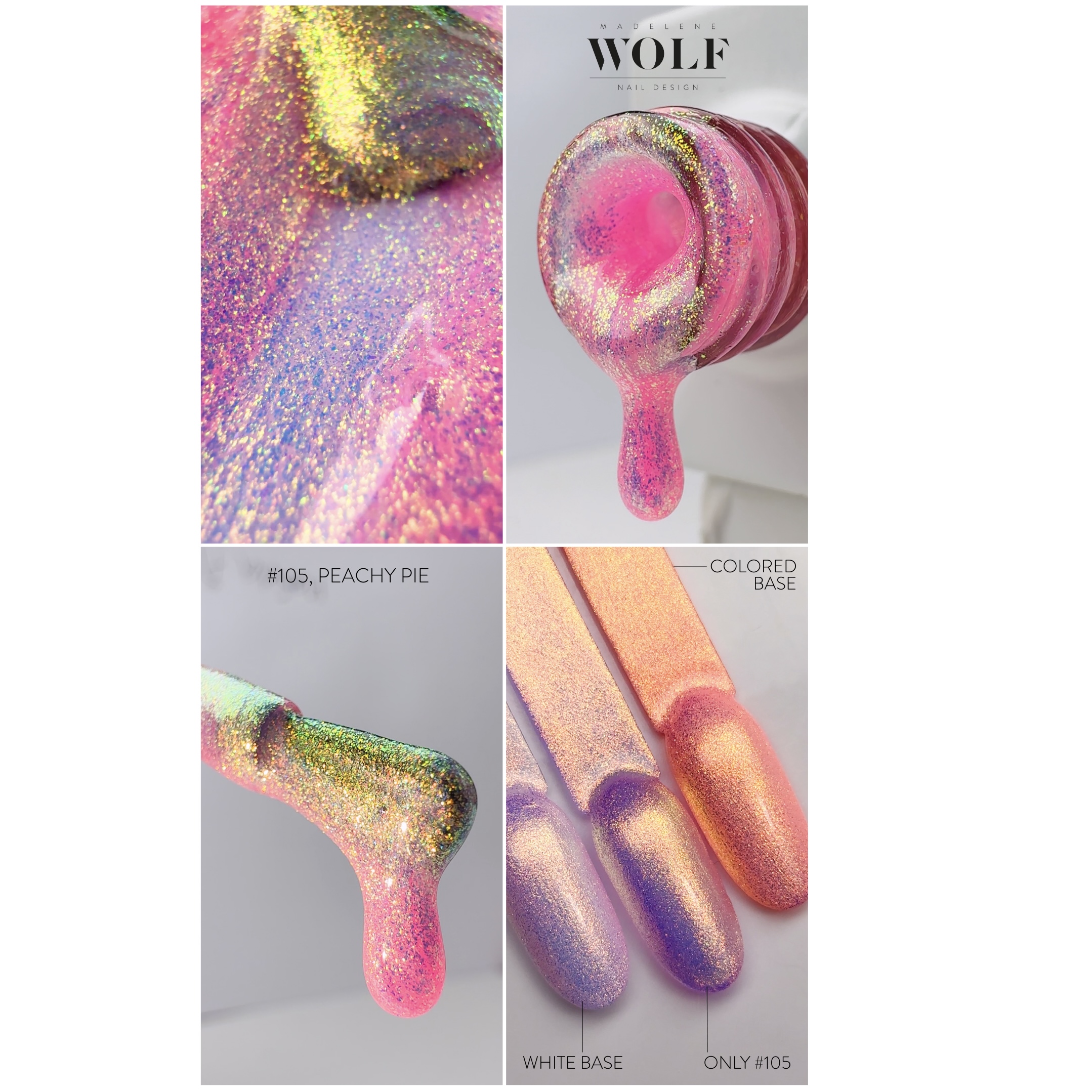 Gel polishen är baserad endast på pigment/skimmer vilket gör att den blir transparent vid tunn applicering, detta för att den ska kunna användas som effekt även ovanpå andra färger.