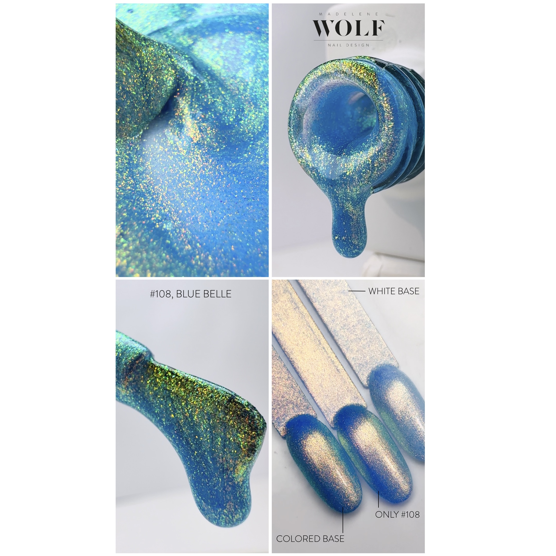 Gel polishen är baserad endast på pigment/skimmer vilket gör att den blir transparent vid tunn applicering, detta för att den ska kunna användas som effekt även ovanpå andra färger.