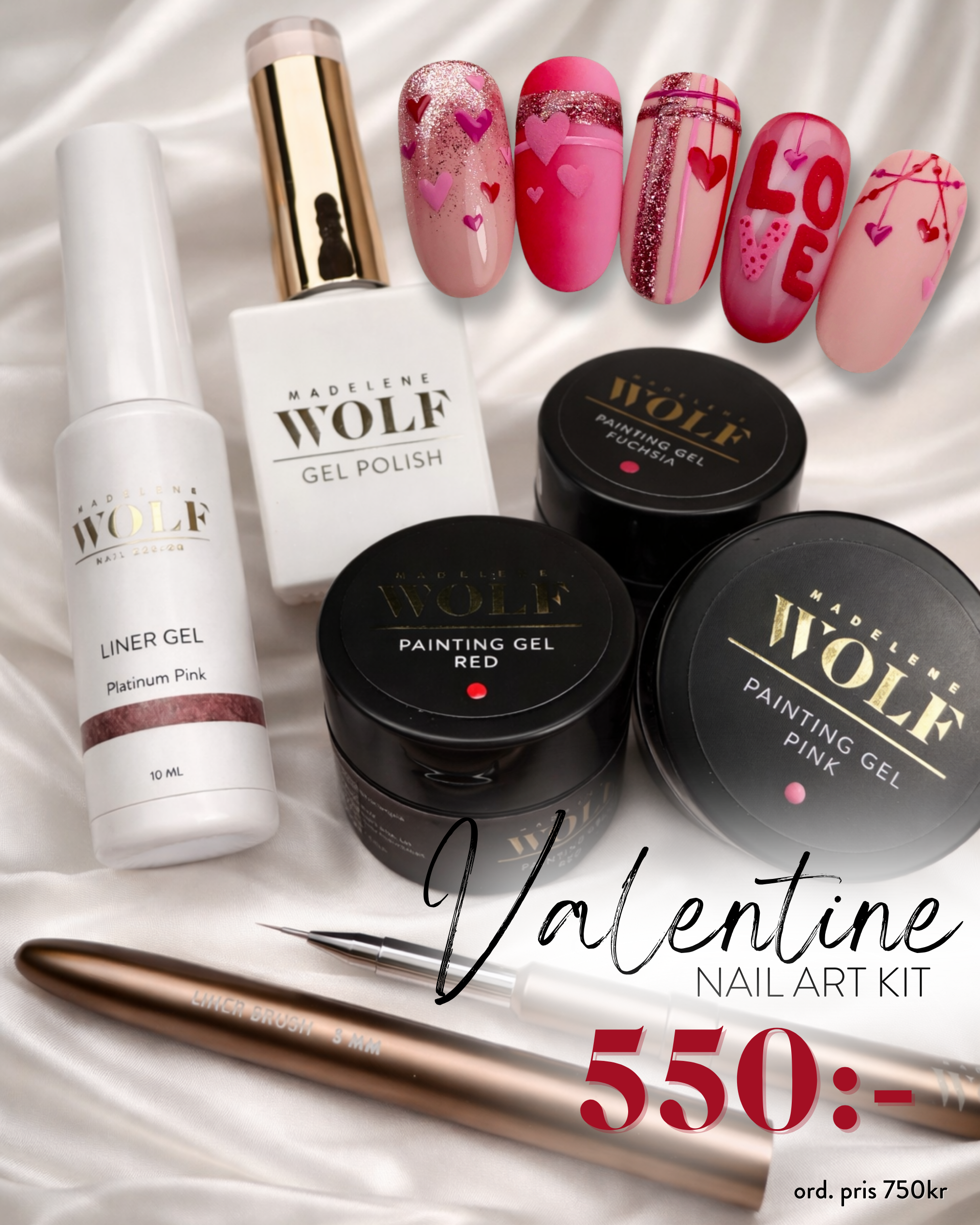 Valentine Nail Art Kit är perfekt för dig som vill kunna erbjuda efterfrågade Alla hjärtans dag-designer, men också bygga designs som funkar året runt i rosa & rött.