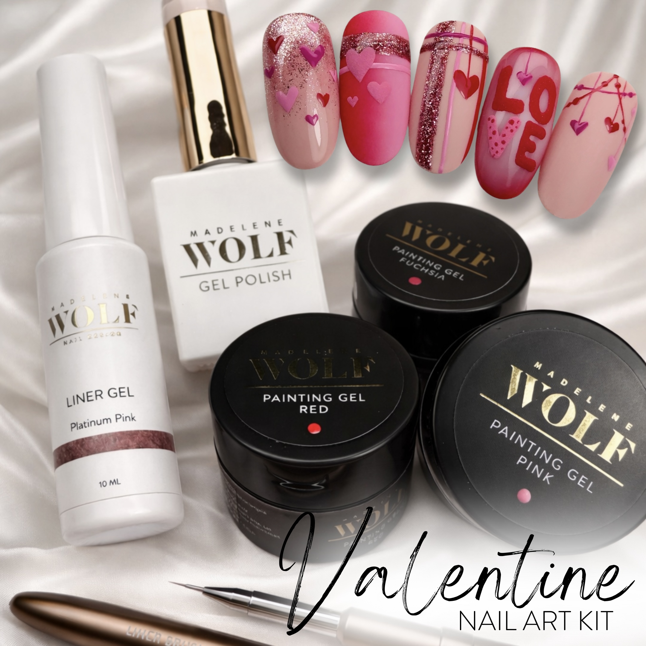 Kitet innehåller noggrant utvalda produkter för att till exempel kunna skapa exempeldesignen på bild, men som även ger maximal kontroll, pigment och precision! Oavsett om du gör tunna linjer, handmålade hjärtan eller effektfulla detaljer med glitter.
